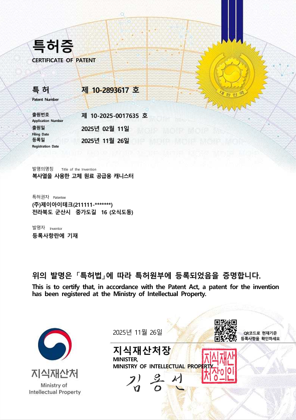 특허권 특허 제 10-2893617호 최고관리자 2026-03-10 16:09:12 21 본문 특허 제 10-2893617호 목록 이전글 특허 제 10-3893622호 다음글 특허 제 10-2681502호 댓글 0 등록된 댓글이 없습니다.